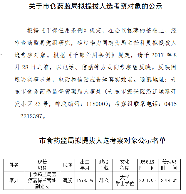 关于市食药监局拟提拔人选考察对象的公示(李力)