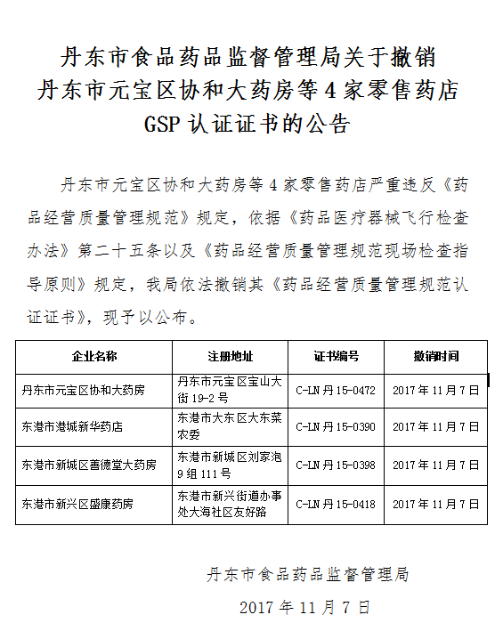 www.48-365365.com关于撤销丹东市元宝区协和大药房等4家零售药店GSP认证证书的公告