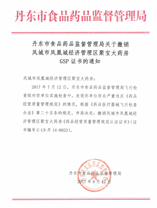 www.48-365365.com关于撤销凤城市经济管理区聚宝大药房GSP证书的通知