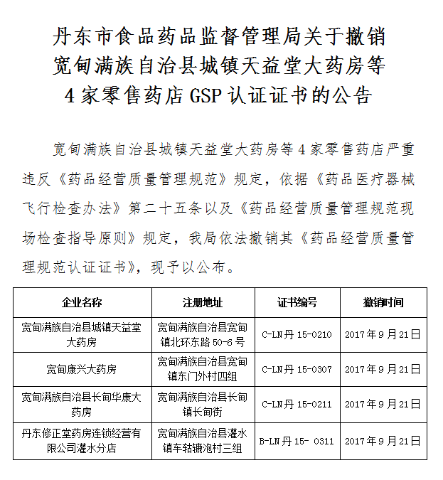 www.48-365365.com关于撤销 宽甸满族自治县城镇天益堂大药房等 4家零售药店GSP认证证书的公告