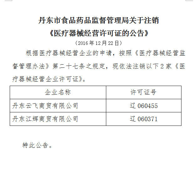 www.48-365365.com关于注销 《医疗器械经营许可证的公告》 (2016年12月22日)